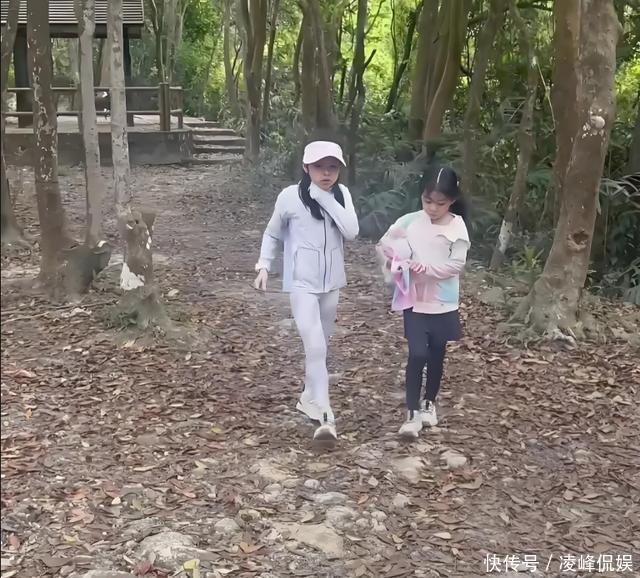 下山的时候,两个小姑娘还是活力满满,看到路边的植物,就好奇地问这问那。郭晶晶和霍启刚轮流给女儿们解答,一路上,一家人有说有笑。