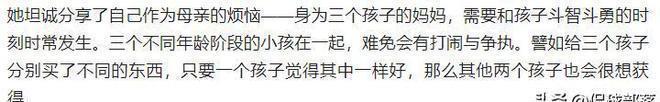 郭晶晶虽说以前是“跳水皇后”,可面对三个孩子时,也忍不住吐槽:“一个一个看,每个孩子都萌得不行,可三个凑一块儿打架,就会觉得他们不可爱了。”